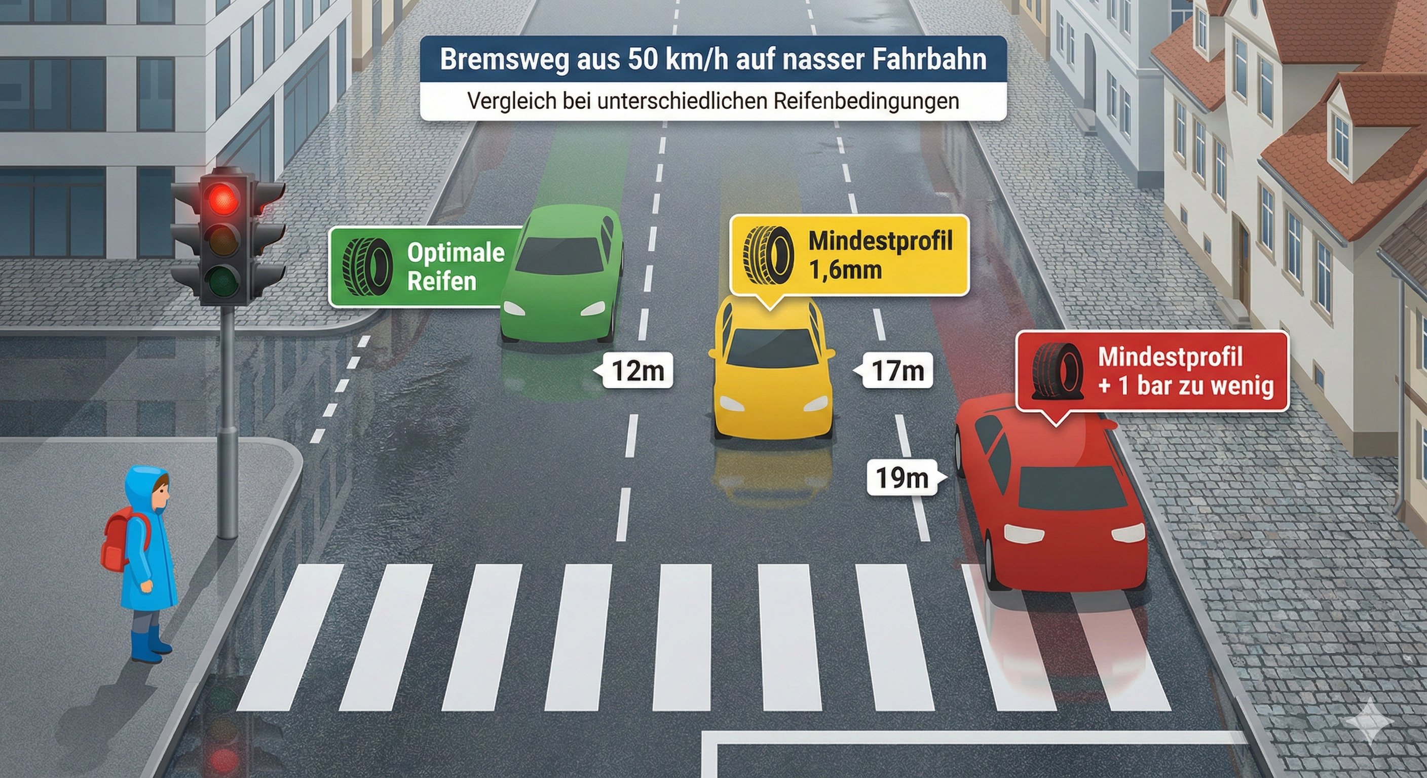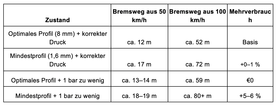 Fazit: Gepflegte Reifen sind im urbanen Alltag kein Luxus, sondern ein Faktor für Sicherheit und Komfort. Wer Profil und Luftdruck im Blick behält, erspart sich nicht nur teure Schäden, sondern fährt auch ruhiger durch den dichten Stadtverkehr. Ein Unterschied von fünf bis zehn Metern beim Bremsweg kann im Stadtverkehr entscheidend sein. Quellen: Daten von ADAC (Bremsweg-Tests), Umweltbundesamt (Kraftstoffverbrauch), DEKRA-Unfallforschung (technische Mängel) und TyreSafe (internationale Reifensicherheit). Wie man Reifen auswählt - Pkwteile.de