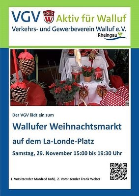 Der Weihnachtsmarkt Walluf findet am 29.11.2025 um 15:00 Uhr auf dem La-Londe-Platz in Niederwalluf statt. Gäste können sich auf über 20 Stände freuen, darunter die Feuerwehr Walluf mit ihrem beliebten Florianspunsch.