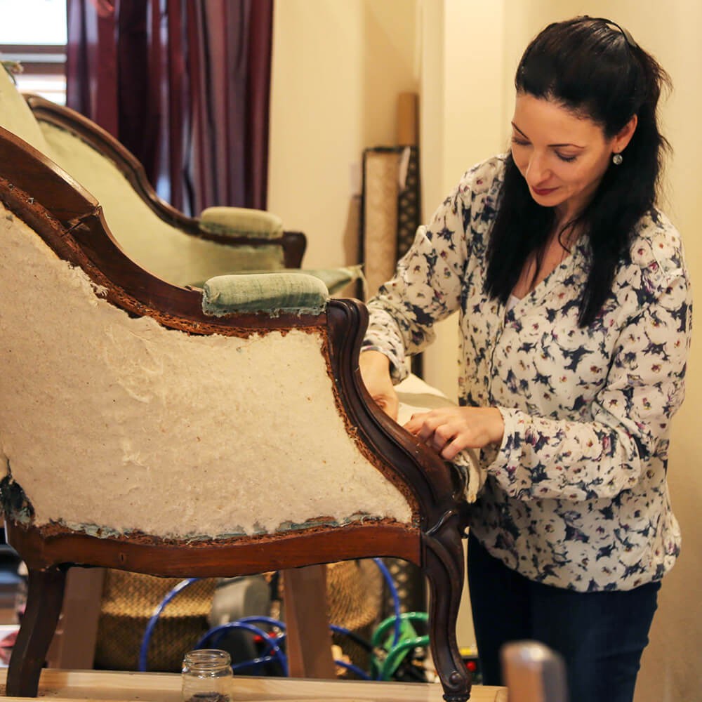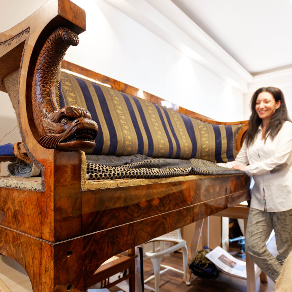 Das Herzstück der PAYOS Polstermanufaktur ist die offene Werkstatt. Dort werden traditionelle Polstermaterialien greifbar und Sofias Handwerkskunst sichtbar. Wer den Laden während der Öffnungszeiten besucht, kann Ihr bei der Arbeit über die Schulter blicken. So könnt Ihr mit eigenen Augen sehen, was bei PAYOS in den versteckten Schichten eines traditionellen Polsters tatsächlich verarbeitet wird. Direkt daneben warten eine Vielzahl an Büchern zu antiken Möbeln, Stilepochen und traditionellen Polstertechniken sowie liebevoll ausgewählte Stoffmuster-Kollektionen auf ihren Einsatz. Hier könnt Ihr gemeinsam mit Sofia Konaka stöbern und Euch zu stilkonformen Restaurierungen beraten und Eure Hände über exklusive Stoffe streifen lassen. Sofia Konaka hat ihren Beruf aus Leidenschaft zu alten Möbeln, Stilepochen und dem Traditionshandwerk gewählt. Ihre Hände schnüren, hämmern, nähen und gestalten seit über zwei Jahrzehnten. Sie greift dafür am liebsten zu Materialien aus der Natur und kümmern sich liebevoll um geschwächte und verletzte Polstermöbel. Ihr Herz schlägt für historische Hintergründe und persönliche Geschichten alter Möbel. Das spürt man, wenn man in der PAYOS Polstermanufaktur zu Besuch ist.